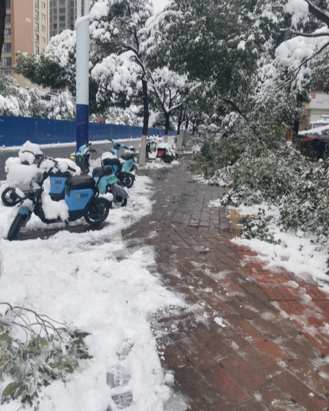 經(jīng)過一夜的積累,積雪已達(dá)十厘米。公司附近的路段正在半幅封閉施工,路面比較狹窄。大雪過后,人行道上有結(jié)冰現(xiàn)象,變得濕滑且容易摔跤,過路的行人走得小心翼翼。路邊的大樹也不堪重負(fù),折斷的樹枝擋住了路人的通行。